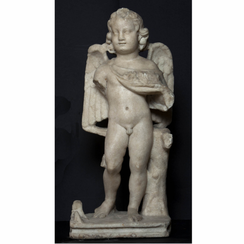 La scultura ritrae un putto, raffigurato stante sulla sua gamba sinistra, mentre la destra è appena piegata e aperta verso l'esterno. Il fanciullo possiede un volto dall'ovale pieno, dai lineamenti delicati e morbidi, tipici dell'infanzia. Il viso ha una fronte ampia, quasi quadrangolare, delle arcate soppraccigliari sfuggenti ed occhi piccoli, appena velati dalle palpebre superiori. Il naso è diritto e dalla punta appena schiacciata, la bocca ha labbra sottili ed è socchiusa in un morbido sorriso vivace. L'acconciatura è costituita da ciocche lunghe e ondulate, che coprono le orecchie e la nuca fino a sfiorare il collo. Esse sono cinte da una corona di fiori. Il fanciullo è nudo, sulla schiena porta due ampie ali ripiegate, dalle grandi piume. Sulla spalla destra si allaccia un mantello ricolmo di fiori. Accanto si trova un tronchetto che funge da sostegno e poggia su una base di forma quadrangolare.