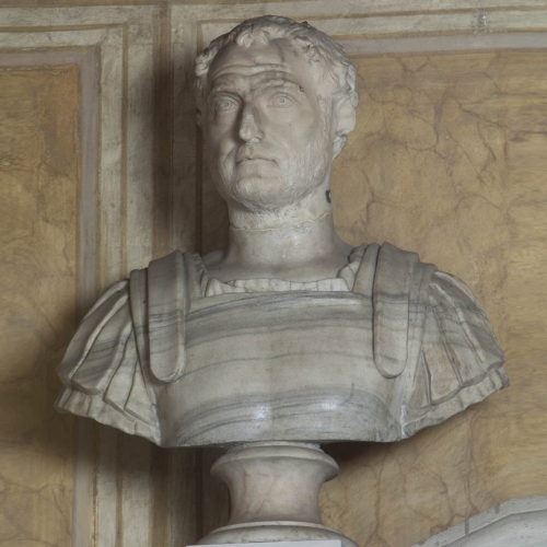 Il busto ritrae una figura maschile: il volto possiede un ovale squadrato, caratterizzato da un'ampia fronte, solcata da rughe profonde e delimitata da arcuate soppracciglia folte che si congiungono nella zona al di sopra del setto nasale. Gli occhi sono grandi e possiedono pupilla e iride incisi. Il naso si conserva solo in parte, ma pare diritto e regolare; la bocca ha labbra sottili contornate da una barba leggera e da baffi. L'acconciatura è costituita da ciocche scomposte più rade sulle tempie.