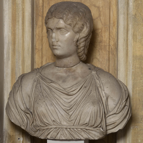 Il busto ritrae una figura femminile dall'aspetto maturo, ma dal modellato morbido e dai lineamenti delicati: la fronte è bassa e di forma triangolare, le soppracciglia sono sottili, rese con piccole incisioni; esse ombreggiano i grandi occhi in cui pupilla e iride sono disegnate, la prima attraverso un solco spesso realizzato con l'impiego del trapano, la seconda con una linea fine, che si interrompe laddove incontra la palpebra superiore appena abbassata a velare lo sguardo. Il naso è abraso, mentre invece si coglie la bocca, dalle labbra carnose. L'acconciatura è divisa al centro del capo da una scriminatura che separa due bande, che scendono morbide e ondulate sulle spalle, per raccogliersi poi al di sotto delle orecchie in una serie di trecce che sono portate sul retro. La testa è rivolta verso destra e poggia su un busto, forse non pertinente: il corpo è vestito di una tunica che si allaccia sulle spalle ed è stretta da una cinta in vita e di un himation.
