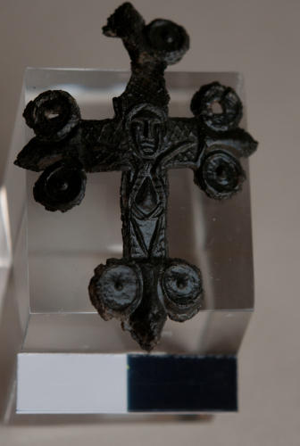 Placchetta/Insegna d pellegrino del tipo Signum Crucis. Si tratta di una croce latina, decorata alle estremità da coppie di lobi circolari che incorniciano una fogliolina di palma a rilievo. I lobo sono decorati da un leggero bordo sulla circonferenza e da un punzone centrale. Manca un lobo in alto a sinistra. I lobi laterali destro e sinistro, in alto, sono forati per permettere lancoraggio della croce a d un supporto di stoffa /tessuto e/o cuoio. La figura del Cristo è disegnata a rilievo in maniera sommaria. Si percepisce lovale del volto, la linea del naso e delle cigli, la bocca. Il corpo è ottenuto mediante una semplice forma ovale, le braccia sono due cavetti filiformi. Filiformi sono anche le gambe, unite alle caviglie a formare una sorta di triangolo. La superficie della croce è decorata da un reticolo di rombi a leggero rilievo