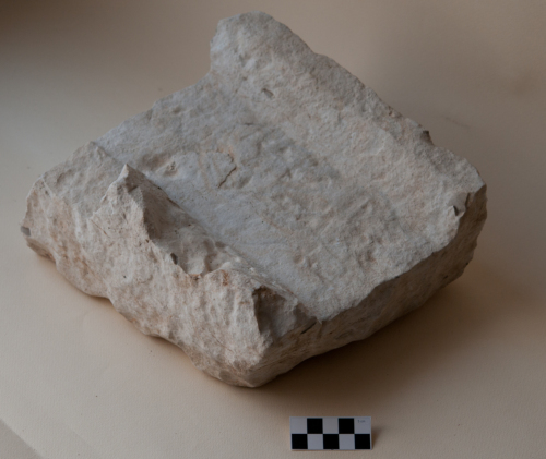 Frammento di calcare bianco, non meglio definito, modellato come una canalizzazione o un elemento architettonico scavato a trapezio.