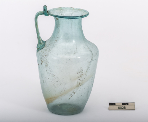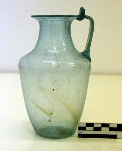 Brocca con largo orlo ribattuto, collo troncoconico a profilo concavo, ansa ricurva a doppia nervatura, saldata all'orlo con fermadito, corpo ovoidale, base piana con leggera concavità centrale. Vetro a colorazione naturale verdeazzurro, trasparente.