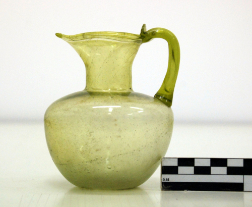 Brocca con orlo estroflesso a imbuto, con labbro ripiegato a cordoncino e beccuccio tirato a pinza, breve collo cilindrico, ansa a bastoncello a sezione ovale ricurva e con fermadito sull'orlo, corpo sferoidale schiacciato, base piana. Vetro gialloverde, trasparente.