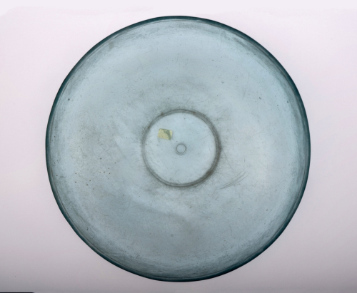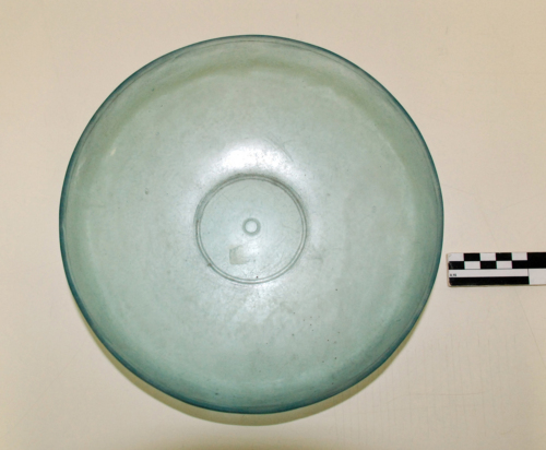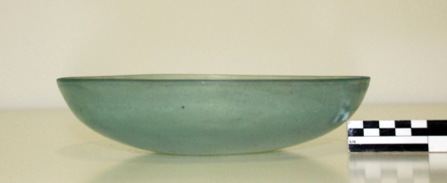 Coppa con orlo indistinto con labbro tagliato e levigato a mola, vasca larga e profonda, con base leggermente concava. All'interno sul fondo un cerchiello inciso tra due cerchi concentrici, all'esterno un sottile solco sotto l'orlo. Vetro azzurro, traslucido e spesso.