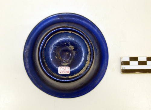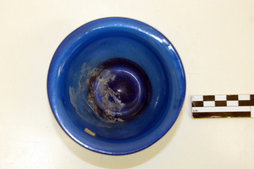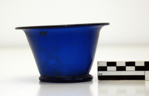 Coppa con orlo estroflesso e labbro arrotondato, corpo troncoconico, base con piede ad anello, concava all'interno, con traccia di pontello. Vetro blu trasparente.