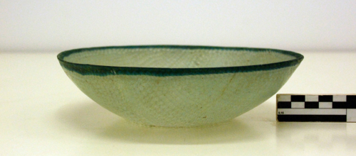 Coppa con orlo indistinto e labbro arrotondato costituito da una canna in vetro turchese a filamento ritorto giallo opaco, vasca poco profonda a profilo curvo con base leggermente concava; lavorata a canne di vetro incolore con filamento ritorto bianco opaco accostate parallelamente (o a reticello).