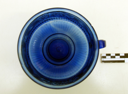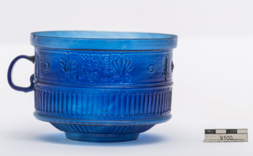 Coppa con orlo verticale aggettante e labbro tagliato, vasca a pareti verticali con carenatura modanata nella parte inferiore, fondo convesso, con piede ad anello sagomato; un'ansa verticale a nastro ad orecchia applicata nella parte mediana della vasca. La decorazione della vasca realizzata a matrice a quattro valve è articolata in due registri; in quello superiore due cartigli quadrangolari diametralmente opposti recano in caratteri greci l'uno ENNI/ONEP/OIESE/N e l'altro MNEZ/EOAGO/RAZO/N, sette motivi ornamentali isolati riempiono lo spazio tra i due cartigli, da sinistra verso destra una palmetta, un cerchiello umbonato, un cedro stilizzato, una stella a sei punte, una colonnina ionica, un cerchiello umbonato e una palmetta di tipo diverso. L'ansa è applicata in coincidenza con una delle stelle. Il registro inferiore è decorato a baccellature verticali, così come il fondo, realizzato in uno stampo a parte, che presenta anche una sequenza di cerchi concentrici a rilievo che costituiscono il piede. Vetro blu trasparente.