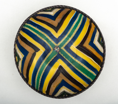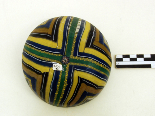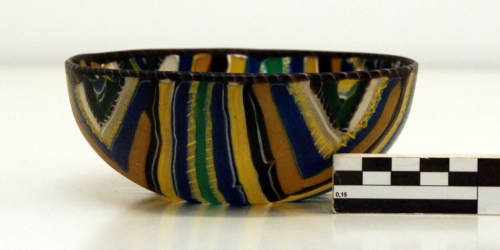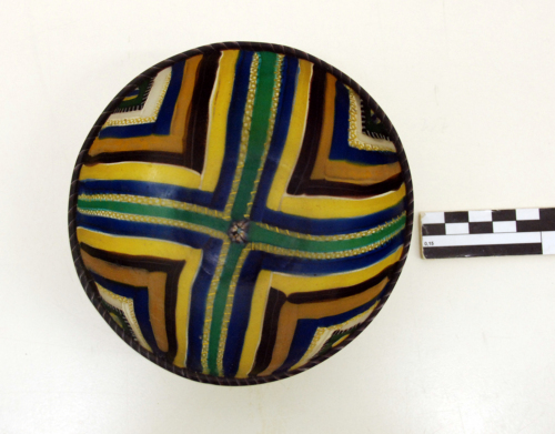 Coppa con orlo indistinto con labbro arrotondato, costituito da una canna applicata di colore porpora con filamento ritorto bianco opaco; vasca a basso profilo emisferico realizzata a mosaico a nastri accostati disposti secondo lo schema a quadranti. Due nastri verdi disposti a croce con una tessera a mosaico composito nel punto di incontro definiscono i quadranti, campiti da fasce angolate di dimensioni decrescenti che si susseguono fino all'orlo secondo un ordine fisso: una canna incolore con filamento ritorto giallo opaco, una fascia blu e una gialla, un filo bianco, una fascia viola scuro con riga bianco opaco in mezzo, una fascia giallo scuro, una blu, una canna incolore con filamento ritorto giallo opaco, una fascia bianca, una canna ritorta blu e bianco opaco, una fascia verde e infine un piccolo triangolo di colore giallo, blu e bianco. Vetro incolore, blu, giallo e viola trasparente e bianco e giallo opaco.