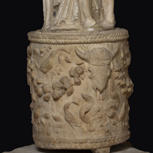 La base, di forma cilindrica, è stata realizzata in marmo; su di essa si notano tre bucrani, dalle ossa mandibolari pronunciate e fronte prominente, da cui partono delle ghirlande colme di foglie e frutta. Attorno al cranio, sotto alle corna, si trovano legate delle tenie, le cui estremità aleggiano svolazzanti sopra i festoni. Campiscono gli spazi vuoti, uccelli che becchettano i frutti o catturano farfalle e insetti.
