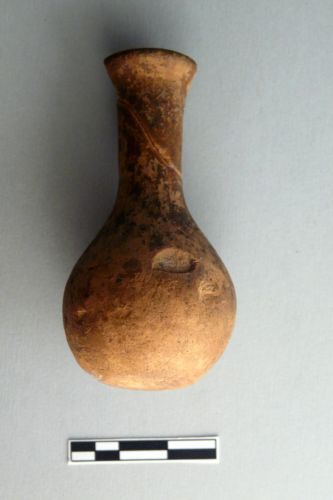 collo alto, labbro svasato, corpo quasi globulare e fondo piano; orlo e collo verniciati