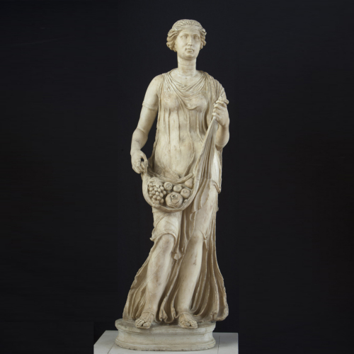 La scultura ritrae una figura femminile stante, che poggia il peso sulla gamba sinistra, mentre avanza la destra. Le braccia sono piegate, la destra meno dell'altra, a sorreggere un panno in cui si raccolgono fiori e frutti, quali melograni e uva. La figura, dal delicato volto dall'ovale pieno, è caratterizzata da una stretta fronte quadrangolare, da grandi occhi appena rivolti verso l'alto, in cui iride e pupilla sono marcati, da un naso diritto e una bocca dalle labbra sottili, appena socchiuse. Sul capo porta i capelli distinti in due bande laterali mediante una scriminatura centrale e raccolti sul retro. Essi sono legati da una tenia spessa e liscia. Indossa un chitone aderente e trasparente dalle maniche corte. Esso scende fin oltre le caviglie scoprendo appena i piedi, che indossano calzature delicate.
