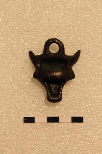 Chiusura a incastro a forma di testa di toro, con muso schiacciato e grandi occhi con pupilla evidenziata. Il pelame è reso sommariamente. Alla sommità del capo, appiccagnolo di forma circolare. Sul retro, che è leggermente incavato, vi è un passante per un elemento trasversale fissante.