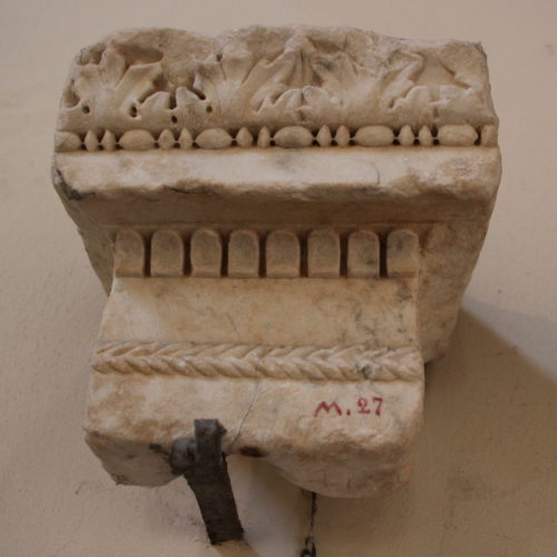 Il frammento conserva solo parte di una cornice in marmo costituita da una sottocornice liscia, in cui si individua una modanatura che riprende un motivo a corda semplice. Al di sopra vi è una fascia decorata con delicate bacellature, in cui i margini degli elementi concavi sono rilevati. Il soffitto è liscio e sovrastato da un kyma, esaltato da un motivo ad astragalo che alterna il succedersi di fusarole e perline. Esse sono state realizzate lavorando al trapano un tondello, tanto che tra ogni elemento si rileva la presenza dei "ponticelli". L'ultima parte della cornice è decorata da foglie, realizzate in alcune zone mediante il semplice impiego dello scalpello, mentre in prossimità dell'angolo sinistro, si rileva l'utilizzo del trapano, la cui lavorazione non è stata in alcun modo mascherata, divenendo invece mezzo per realizzare un vivace gioco tra luci e ombre.