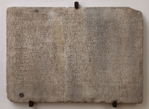 - NOTIZIE STORICO CRITICHE La stele è databile al sec. II d.C. sulla base delle caratteristiche della scrittura, mentre incerta ne rimane la provenienza, per quanto sia comunemente considerata una produzione di Paro per il fatto che Sokratea si definisce di Paro e per la presenza di altre stele parie disperse a Venezia. La stele fu trasportata a Venezia dalla Grecia a opera di Michele Sosiano prima del 1565, anno della sua morte, e successivamente divenne parte della Collezione di Giovanni Grimani. Essa risulta costituita di due frammenti ricomposti, giunti in Museo in tempi diversi: un frammento faceva parte del lascito Grimani del 1586 ed era già presente al momento dell'allestimento dello Statuario Pubblico; l'altro frammento rimase a Palazzo Grimani e fu donato alla Marciana nel 1812 da Virginia Chigi-Grimani. L'iscrizione consiste in un epigramma funerario in nove distici elegiaci, articolato in forma di dialogo tra la defunta Sokratea di Paro e un passante. Sokratea, interrogata dal passante, ringrazia il marito Parmenione per avere eretto il monumento funebre e racconta di essere morta di parto a trentasei anni dando alla luce il terzo figlio, anch'esso morto con lei; il passante, commosso per la triste vicenda, prega Persefone perché la accolga tra i cori dei beati. L'epigramma si conclude con l'augurio benevolente di Sokratea perchè le divinità siano ben disposte nei confronti di chi, passando, le rivolge un saluto. In basso, la firma del poeta Dionysios di Magnesia.