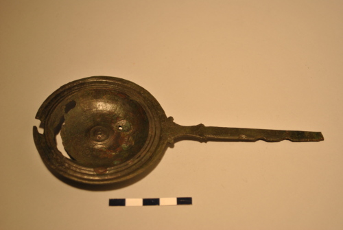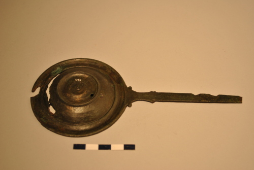 Pàtera con ampio orlo a tesa sagomato; vasca poco profonda umbilicata. Fondo con piedino rilevato. Lungo manico rettangolare, frammentato, con due volute all'attacco con la vasca.