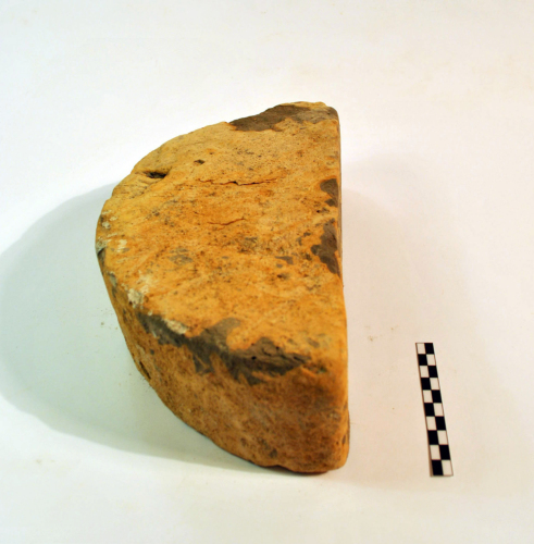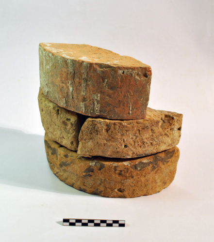 Quattro mattoni di cui uno semicircolare e gli altri quarti di cerchio. Il I è un quarto di cerchio di terracotta rosata con grossi inclusi, tracce di malta biancastra sul lato esterno e interno; Il II è un quarto di cerchio di terracotta giallo-grigiastra con grossi inclusi, tracce di malta biancastra e grigiastra; il III, IG 38857, è un quarto di cerchio di terracotta giallino-grigiastra con grossi inclusi, tracce di malta biancastra e grigiastra, sulla superficie inferiore, traccia di incisione lungo il bordo curvilineo e su un lato rettilineo, profonda e ampia impressione trasversale alla superficie piana con tracce di malta biancastra allinterno; il IV è un semicerchio di terracotta giallastra con tracce di malta biancastra e grigia e una linea incisa o impressa lungo il bordo rettilineo.