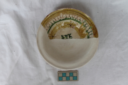 Piattello con piede ad anello, breve vasca emisferica schiacciata, breve tesa obliqua e labbro appiattito. La superficie interna è ingobbiata, graffita e dipinta in giallo e verde sotto vetrina. La superficie esterna è ingobbiata e invetriata solo in corrispondenza dell'orlo. Colature di vetrine percorrono il rovescio. La tesa è decorata da una fascia campita da squame, mentre al centro del cavetto è presente un fiore graffito, dipinto in verde, racchiuso da una fascia dipinta in giallo includente dei motivi stellati graffiti.