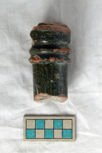Frammento di colonnina modanata ricoperta da vetrina di colore verde.