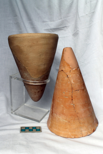 Due forme per la lavorazione dello zucchero, in terracotta non rivestita, con corpo a profilo conico aperto alle due estremità. Il cono A presenta un impasto di colore rosa, il B di colore grigio. La superficie esterna è lisciata sul fondo.