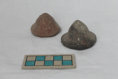 Due distanziatori in ceramica comune di forma conica a profilo arrotondato, ingrossato alla base. La superficie esterna è lisciata. L'impasto stracotto ha assunto colore grigio.