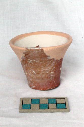 Vaso da spezie con piede a disco, vasca troncoconica svasata verso l'alto, orlo estroflesso, labbro arrotondato. La superficie interna è ingobbiata e in origine rivestito di vetrina piombifera incolore. La superficie esterna non è rivestita e presenta alcune chiazze sparse di ingobbio. Sul piede si notano i segni lasciati dalla cordicella per strozzatura.