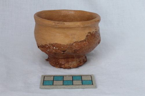Olletta con alto piede a ventosa mal sagomato e corpo globulare. La superficie interna e quella esterna sono ricoperte da vetrina di colore marrone.
