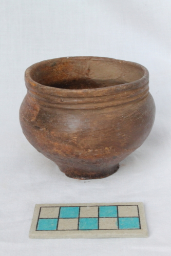 Olletta con piede a disco rialzato e leggermente a ventosa, corpo globulare, orlo verticale sagomato esternamente da tre cordoni e labbro arrotondato. La superficie interna è ingobbiate e rivestita da vetrina di colore marrone, mentre la superfrcie esterna è parzialmente ingobbiata e invetriata fino al piede. Quest'ultimo mostra i segni dello stacco dal tornio per strozzatura della cordicella.