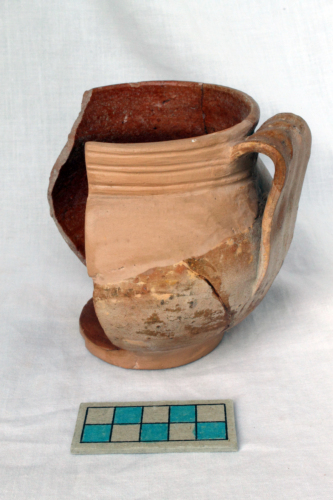 Olletta con piede a disco, corpo globulare, orlo verticale sagomato esternamente da cordoni e labbro leggermente estroflesso. Sulla spalla si innesta un'ansa a nastro cordonata. La superficie interna è rivestita da vetrina di colore marrone, mentre quella esterna è invetriata solo in corrispondenza dell'orlo e della parte superiore dell'ansa. Si rilevano chiazze di vetrina sul ventre.
