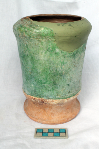 Albarello con alto piede a disco distinto, corpo cilindrico rastremato e spalla sporgente. La superficie esterna è ingobbiata e ricoperta da vetrina di colore verde con risparmio del piede. La superficie interna è ricoperta da vetrina di coore marrone chiaro.