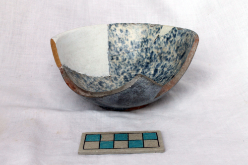 Scodella con basso piede a disco, corpo a profilo emisferico, orlo indistinto e labbro assottigliato. La superficie interna è ingobbiata e dipinta in blu, con effetto maculato, sotto vetrina piombifera incolore. La superficie esterna è ingobbiata, dipinta in blu e invetriata.