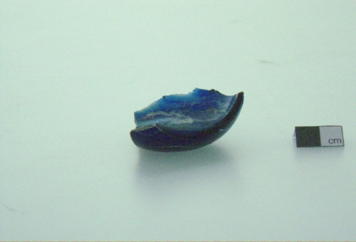 corpo a profilo convesso; fondo piano. Vetro soffiato blu opaco con decorazione costituita da filamenti in vetro bianco opaco applicati a caldo.