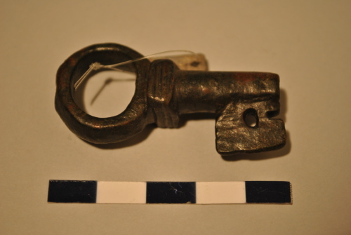 Chiave a mandata con stelo tubolare, cavo. Dente laterale dotato di incavo e forellino passante. Anello circolare unito allo stelo da un elemento rettangolare modanato.