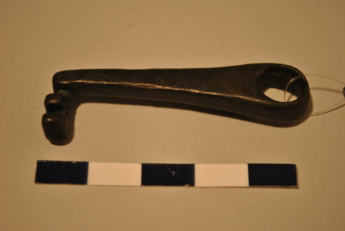 Chiave a scorrimento con stelo rettangolare. Elemento trasversale dotato di due denti consunti. Anello circolare.