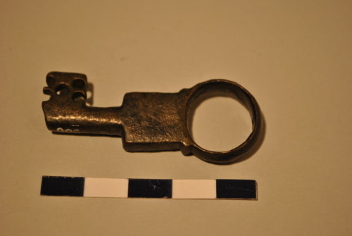 Chiave a mandata con anello circolare e stelo di forma inizialmente rettangolare. Innesto tubolare, cavo. Elemento trasversale di forma rettangolare, dotato di cinque piccoli fori.