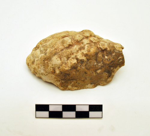 Lucerna a pigna con squame in rilievo pseudo romboidali e tondeggianti. Tipo di lucerna diffusa in Nord Italia e nelle province Settentrionali. L'argilla è di colore nocciola chiaro.