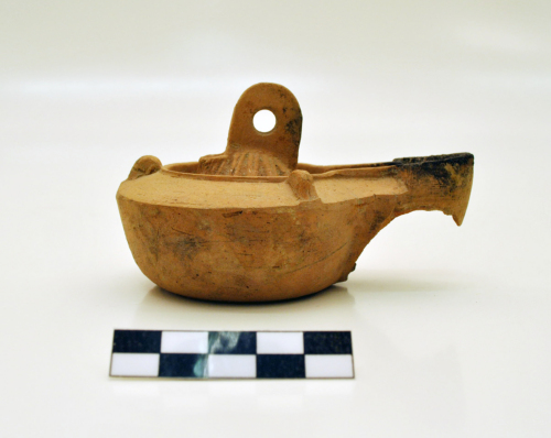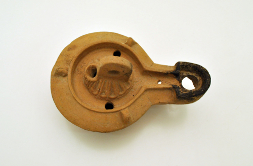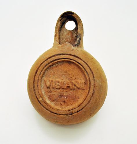 Lucerna "firmalampen" a canale aperto, spalla larga inclinata verso il basso decorata da tre borchietta di forma tronco-piramidale con linea incisa al centro, lanello in rilievo delimitante la spalla prosegue lungo il beccuccio fino al foro di bruciatura delimitando allinterno un ampio canale nel quale al centro è un foro di sfiato, mentre due infundibula sono disposti orizzontalmente e ai lati nel disco, mentre la parte centrale del disco è decorata da fitte baccellature e si innalza formando al culmine un archetto con foro per la sospensione, in asse con questo archetto è un altro infundibulum sulla sommità, base delimitata da due solcature concentriche, allinterno delle quali è impresso il bollo VIBIANI. Tipo diffuso in Italia settentrionale e nelle province centro-settentrionali. L'argilla è di colore nocciola, beccuccio annerito dal fuoco.