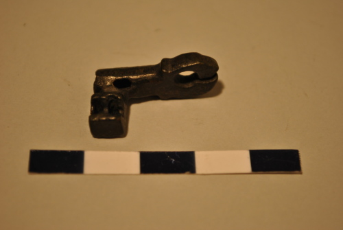 Chiave a mandata con anello poligonale fessurato. Corto stelo tubolare, cavo. Elemento trasversale di forma rettangolare, con incavo, finestrato.