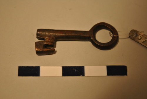 Chiave a mandata con anello circolare. Stelo tubolare, cavo. Elemento trasversale rettangolare con un dente di forma triangolare.