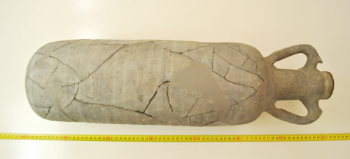 Anfora probabilmente adibita al trasporto di salsa di pesce con orlo a fascia piatta, collo cilindrico rastremato verso la bocca, corpo cilindrico con fondino conico, anse a sezione semicircolare ad andamento curvilineo con apicatura sul gomito, impostate sul collo e all'inizio della spalla. L'argilla, depurata, è di colore grigio ferro, dovuto a cattiva cottura, tracce di deposito resinoso allinterno.