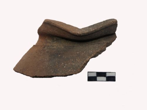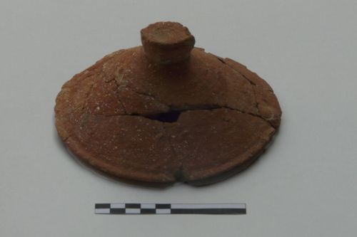 orlo a sezione quadrangolare, distinto da una leggera solcatura dal corpo troncoconico schiacciato, presa a bottone. Corpo ceramico molto grossolano con grossi inclusi affioanati anche sulle superfici