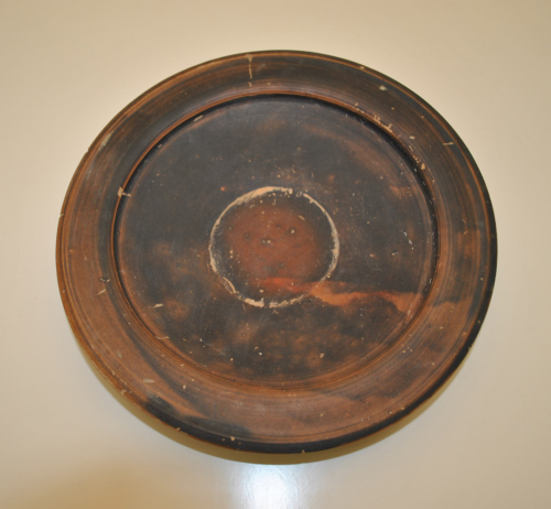 Piatto con labbro a tesa a profilo ondulato, vasca poco profonda a pareti interne leggermente concave, pareti svasate a profilo rettilineo e carenato in prossimità della tesa, piede modanato a spigolo vivo, tracce di cerchio inciso, in prossimità del piede, sul bordo esterno, piatto del piede, due tacche incise una da una parte laltra dall'altra perfettamente in linea orizzontale, sulla parete interna del piede, tracce di cerchio inciso. L'argilla è di colore beige-arancione, la vernice è nero, opaca, diluita, tracce di impronte digitali in prossimità del piede, fondo del piede con vernice bruno-marrone e umbone di tornitura, al centro della vasca la vernice è rossastra da disco d'impilamento.