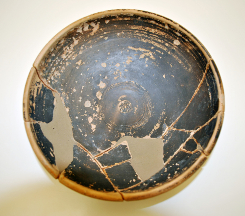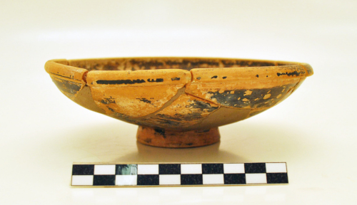 Coppa con orlo ingrossato a sezione triangolare, distinto dal corpo da un gradino esterno, pareti molto svasate, a profilo convesso, piede ad anello a profilo obliquo, fondo non verniciato, evidenti tracce di tornitura sulla parete esterna, al centro della vasca interna è una decorazione costituita da una fascia di rotellatura a quattro giri di trattini obliqui verso s. e al centro è impressa una margherita con petali a raggiera e pistillo tondo in rilievo. L'argilla è di colore beige-arancione, la vernice è nero-bruna, opaca, diluita, tracce di impronte digitali in prossimità del piede.