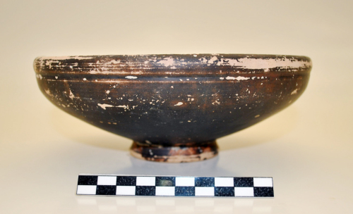 Coppa con orlo a mandorla, sottolineato esternamente da una solcatura, pareti molto svasate a profilo convesso e inflesse verso lorlo, tracce di due linee concentriche orizzontali sulla parete esterna, piede ad anello a profilo obliquo, fondo non verniciato, e umbone di tornitura, al centro della vasca interna vi è una solcatura circolare attorno alla quale sono disposte, a croce, quattro palmette stilizzate, impresse; al di sopra di esse è una fascia di rotellatura a trattini obliqui verso s. L'argilla è di colore beige-arancione, la vernice è nero-bruna, opaca, tracce di impronte digitali in prossimità del piede.