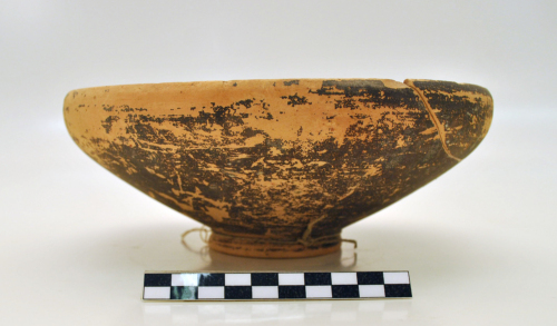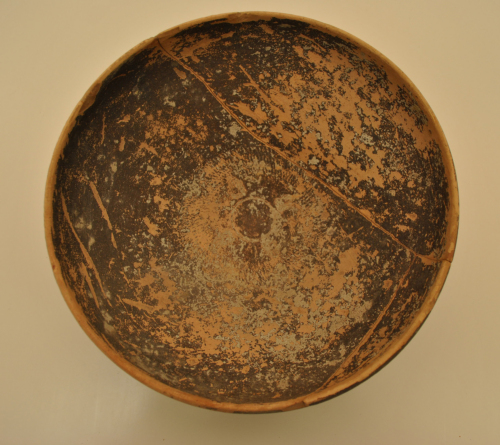 Coppa con orlo rientrante e assottigliato, pareti a profilo quasi rettilineo e inflesse verso lorlo, piede ad anello a profilo obliquo, fondo non verniciato e umbone di tornitura, al centro della vasca interna vi è una solcatura circolare attorno alla quale sono disposte, a croce, quattro palmette stilizzate, impresse, al di sopra di esse è una fascia di rotellatura a trattini obliqui verso s. L'argilla è di colore beige-arancione, la vernice è nero-bruna, opaca, diluita, tracce di impronte digitali in prossimità del piede.