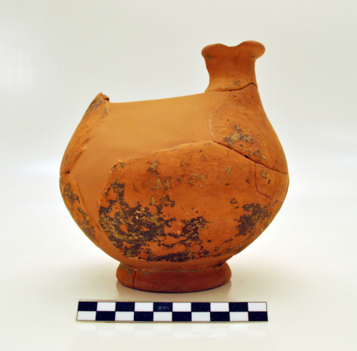 Askos con corpo globulare, pancia con curvatura molto accentuata nella parte mediana della sua altezza, bocca con labbro svasato, collo cilindrico, piede ad anello a profilo arrondato, foro allattaccatura dellansa. L'argilla è di colore beige-arancione, la vernice è nero-bruna, opaca.