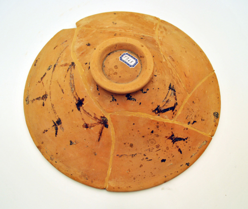 Patera con orlo diritto, pareti scampanate a profilo quasi rettilineo, piede ad anello a profilo obliquo, sulla parete esterna, tracce di decorazione a fasce con elementi geometrici, si riconoscono 2 fasce orizzontali, concentriche, tagliate da fasce verticali. L'argilla è di colore beige-arancione, la vernice è nero-bruna, opaca.
