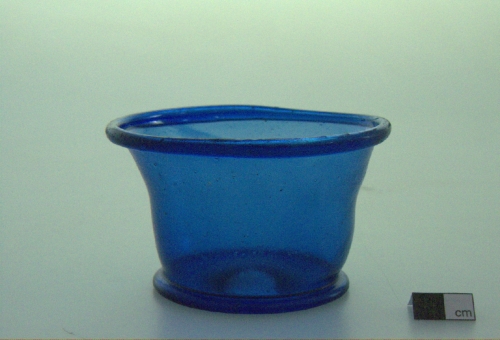 labbro esoverso e ribattuto all'esterno a cordoncino, corpo troncoconico e fondo leggermente concavo con piede ad anello. Vetro blu cobalto trasparente.