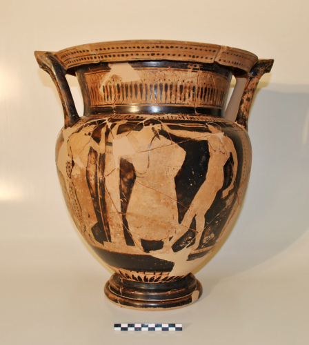 Cratere a colonnette con ampio orlo piatto e labbro pendulo, collo troncoconico rovesciato e distinto dalla spalla breve. Piede svasato e modanato con due tori, cavo all'interno. L'interno del cratere è verniciato con vernice nera, lucida. Sull'orlo, fila di boccioli di loto intrecciati, sulle anse, palmetta tra due volute, sul labbro, tralcio d'edera stilizzato, sul collo, campo riempito con boccioli di loto allungati, intrecciati ed inframezzati da punti, il tutto in vernice nero-bruna, opaca. Sul corpo, due scene figurate inquadrate, sopra, da baccellatura, ai lati, da tralcio d'edera stilizzato e sotto, da linea orizzontale, risparmiata. Al di sopra del piede, corona di raggi. Sul lato A, scena di palestra: all'estremità s., figura maschile nuda stante sulla gamba d. e con la s. piegata all'indietro, rivolta verso d., reggente, con la mano s., un lungo bastone, in posizione verticale; méta-colonna poggiante su un plinto e coronata da kymation; al centro della scena, figura maschile (paidotribes) barbata e panneggiata, stante di tre quarti verso s., con gamba d. piegata in avanti, gamba s. stesa e testa rivolta all'indietro, regge, con la mano d. sollevata e in posizione orizzontale dietro la testa, un bastone con terminazione biforcuta (rabdos); all'estrema d., figura maschile nuda con uno degli halteres nella mano s. abbassata, mentre il braccio d. è proteso in avanti, la figura è in procinto di saltare verso s. Lato B: due figure maschili nude in rapido movimento verso d. si dirigono verso un'altra figura maschile nuda che va loro incontro. L'argilla è di colore nocciola rosata, ingobbiatura di colore arancio pallido, assai consunta, vernice bruna, lucida nelle parti ben conservate, allinterno, spessa vernice bruna opaca.