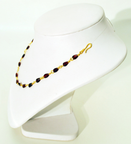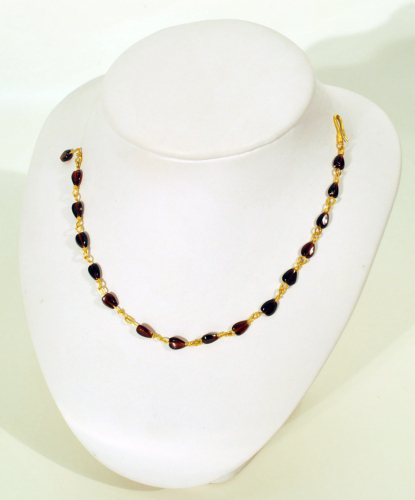 Collana composta da maglie di ca. 1 cm di lunghezza formate da un filo in oro. Ogni segmento di filo ha una estremità chiusa ad anello e una infilata nella gemma e quindi nell'anello della maglia successiva; infine, è avvolto su stesso. La sezione del filo d'oro è appiattita soprattutto in corrispondenza dell'anelllo, più tondeggiante all'altra estremità. Le sedici gemme conservate sono omogenee per colore, dimensione e taglio a forma di cuore. All'estremità di chiusura della collana un segmento di filo aureo forma un gancio che doveva trovare un occhiello funzionale alla chiusura, ora mancante. La tipologia della collana è nota nella tradizione dell'oreficeria ellenistica, in particolare tarantina tra III e I sec. a.C., ma i modelli trovano ampia diffusione nella prima età imperiale romana (I-II sec. d.C.). Nell'Italia nord-orientale sono noti un numero limitato di esemplari di questo tipo a Brescia, nel Trentino e ad Aquileia.