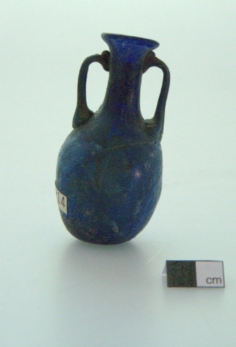 labbro esoverso e ribattuto a cordoncino;collo cilindrico; ventre ovoidale;fondo piatto. Sotto il labbro sono saldate due anse tubolari impostate sulla spalla sfuggente, modellate a parte e applicate a caldo. Vetro blu, trasparente; anse in vetro blu opaco.